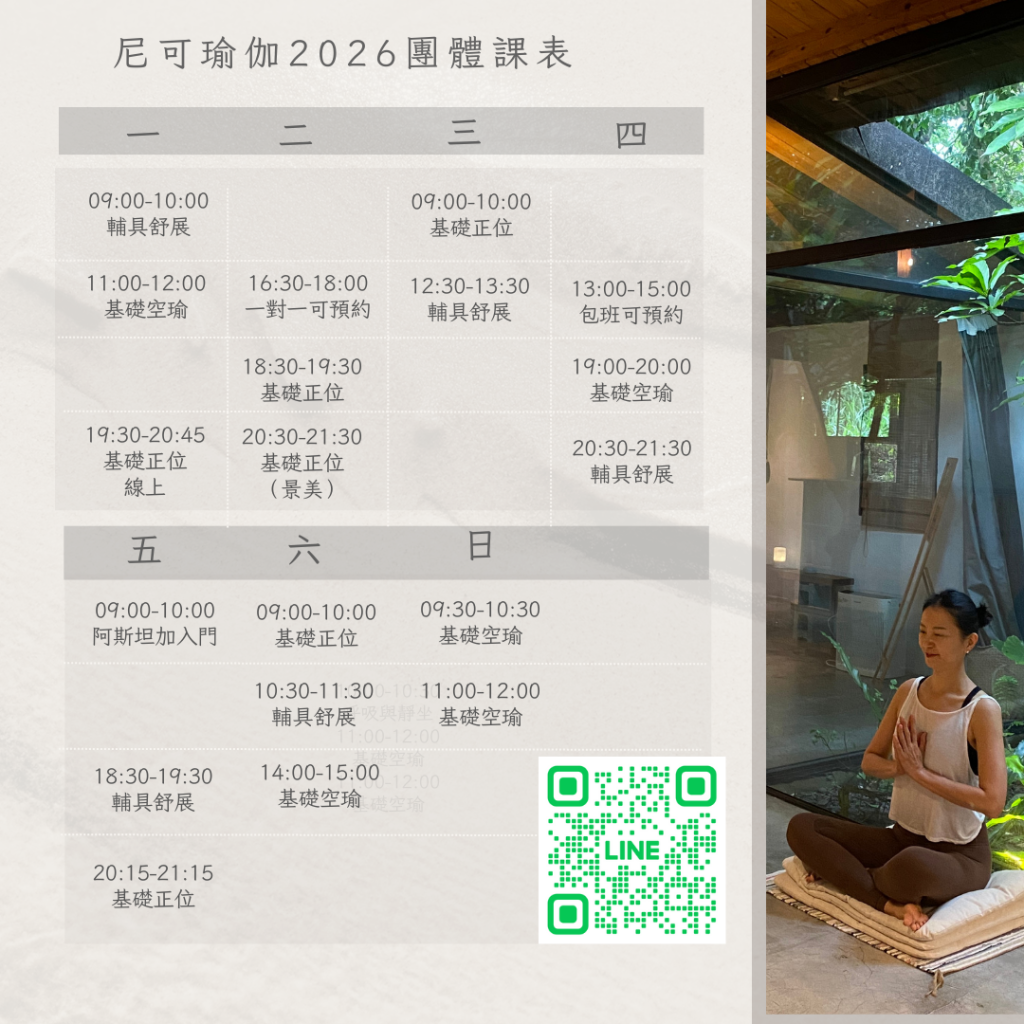 單日、多日的戶外瑜伽活動。繁忙之餘,空出時間,跟著尼可來到這些精挑細選的場地中,讓自己的身體、心靈、頭腦放鬆,重新再次補足能量。旅行地點目前有:台北內湖、泰國清邁。查看活動表
